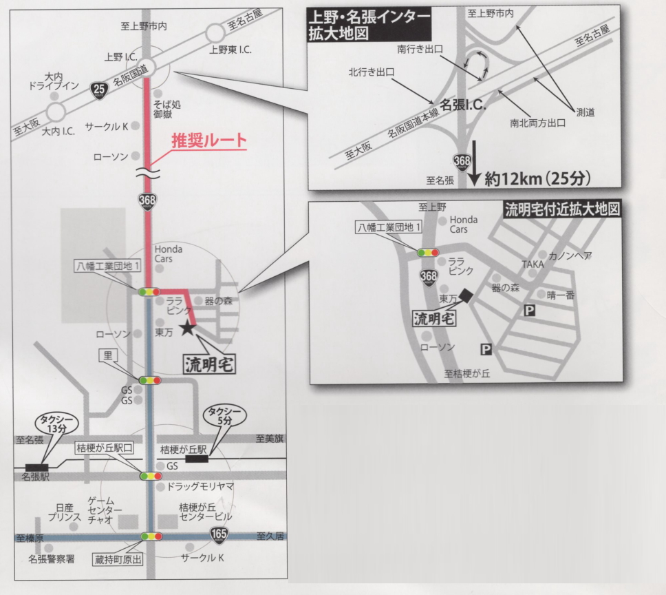 大阪方面から、西名阪自動車道→天理インター→名阪国道(国道25号線)→上野(名張方面)インター降りる 名古屋方面から、東名阪自動車道→亀山インター→名阪国道(国道25号線)→上野(名張方面)インター降りる→国道368号線を南方へ約25分→八幡第一信号左折1分